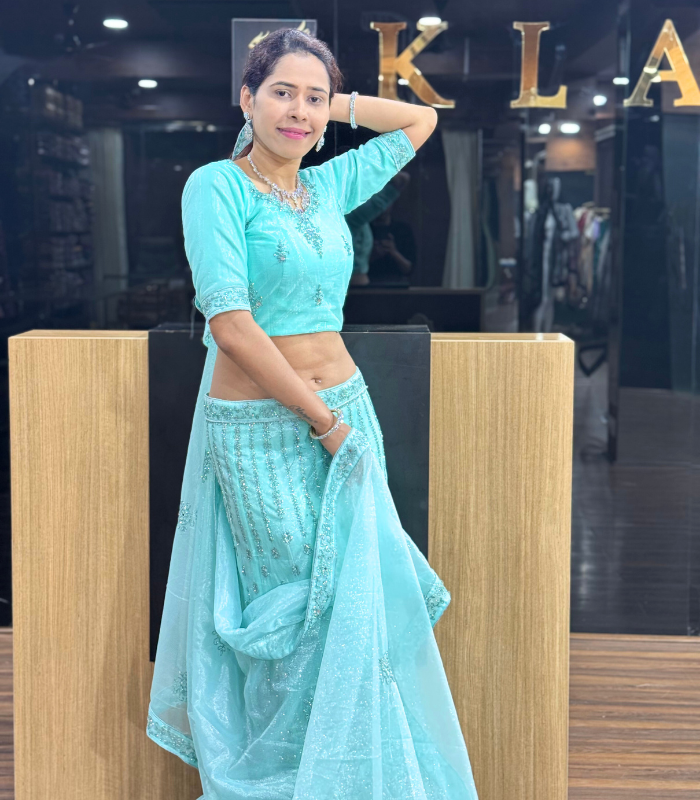 A dreamy aqua net lehenga adorned with delicate embroidery and soft shimmer. Light, elegant, and perfect for graceful celebrations.