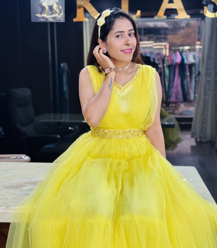 Step into a fairytale look with this stunning sunshine yellow ball gown. Designed with a sleeveless structured bodice, this dress offers both elegance and comfort. The waist is beautifully highlighted with a delicate embellished belt that adds a touch of sparkle and definition.