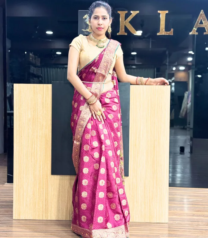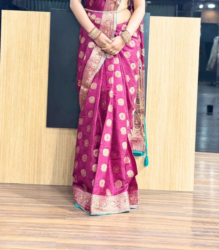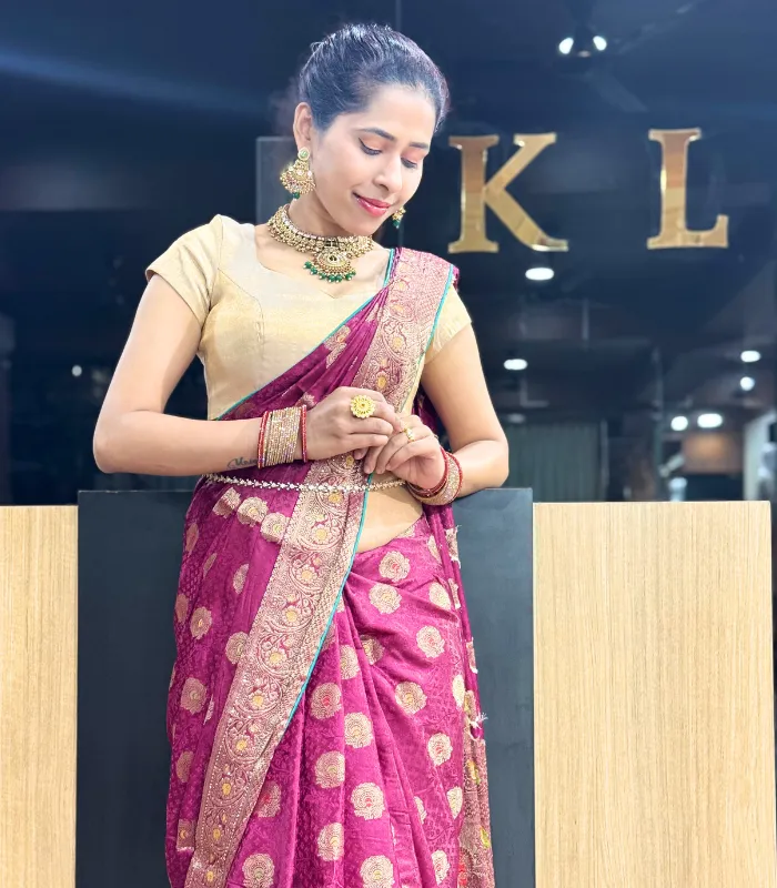 This fancy maroon saree radiates timeless elegance and royal charm.