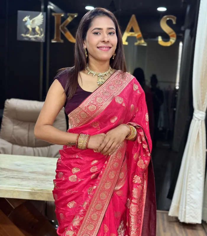 An elegant silk saree adorned with delicate gold zari motifs, offering a perfect blend of grace, tradition, and modern sophistication—ideal for festive and special occasions.