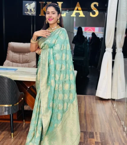 Designed to move with grace, this fancy saree brings a fresh perspective to contemporary ethnic wear. Its smooth flow, refined texture, and delicate finish create a silhouette that feels polished yet relaxed. Perfect for celebrations, stylish gatherings, or elegant day events, this saree transforms simplicity into a powerful style statement.