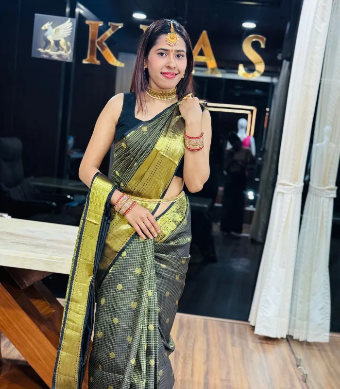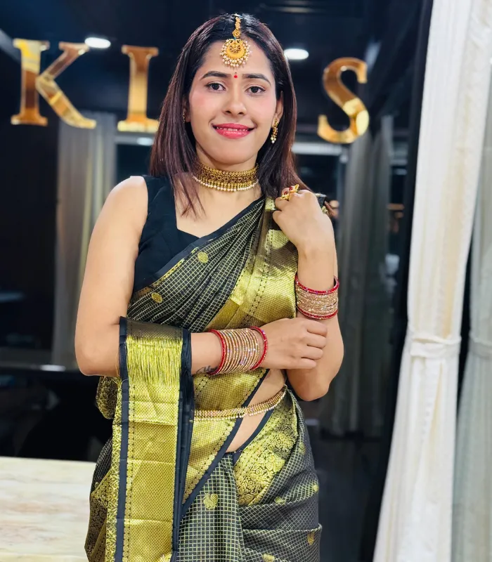 Elegant black and gold silk saree featuring rich zari weaving and a grand pallu. Paired with a contrast black blouse, this saree is perfect for weddings, festive occasions, and traditional celebrations.Make a bold and graceful statement with this stunning black and gold silk saree. Designed with intricate zari weaving throughout, the saree beautifully blends traditional craftsmanship with a timeless color combination. The rich golden pallu adds a regal touch, while the subtle woven motifs enhance its overall elegance.