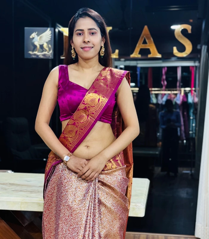A rich Magenta Wine Kanjivaram silk saree adorned with antique gold zari work, perfect for weddings, festive occasions, and traditional celebrations.
