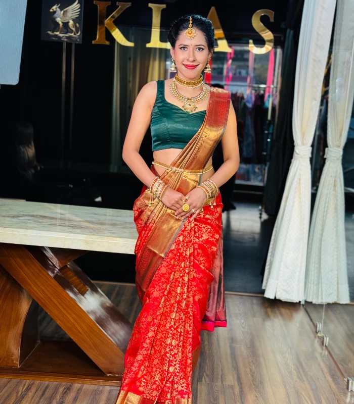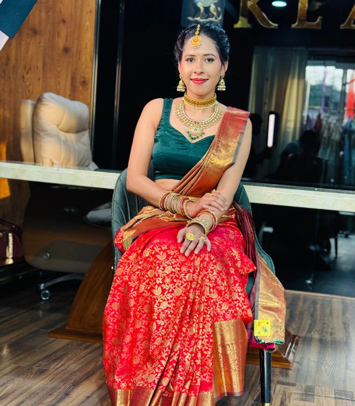 A stunning red silk saree with rich gold zari work, paired beautifully with a contrast green blouse. Perfect for weddings, festive occasions, and traditional celebrations.