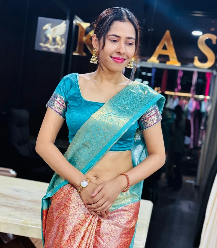 A statement silk saree in deep Neelam teal paired with soft blush-gold zari, crafted for timeless celebrations.