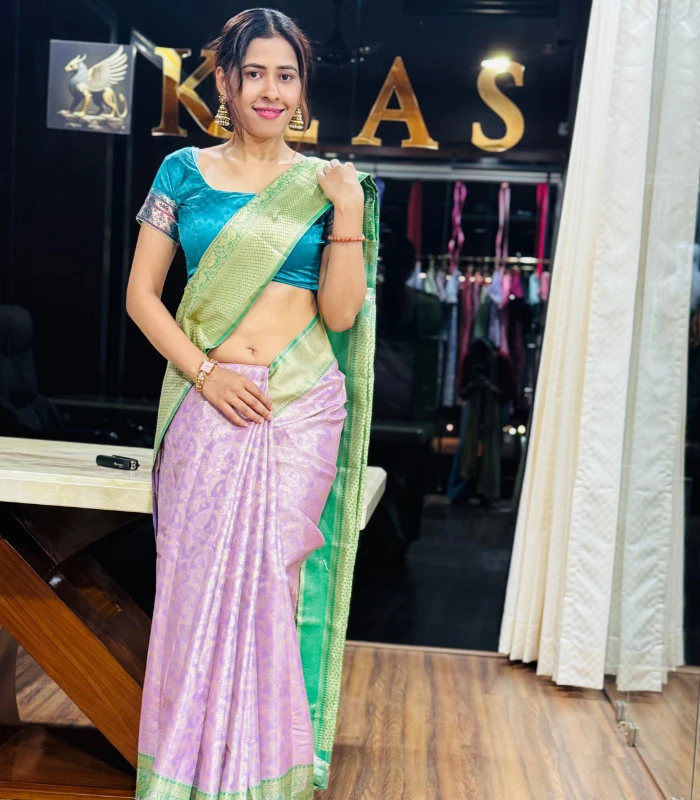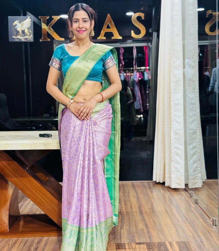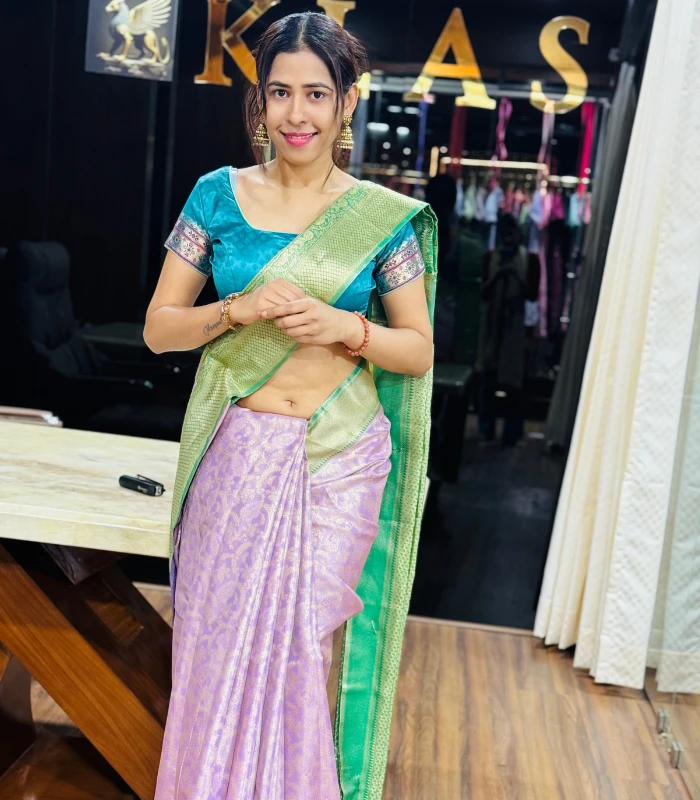 This exquisite pastel lavender saree is a beautiful blend of softness and sophistication. The subtle woven motifs on the lavender base add a delicate charm, while the contrasting emerald green pallu brings richness and depth to the look. Paired with a teal green blouse featuring traditional sleeve detailing, this saree strikes the perfect balance between classic elegance and modern grace.