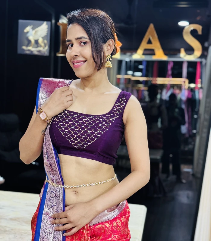 Make a bold and beautiful statement with this stunning red-pink silk saree featuring intricate gold zari weaving and a striking royal blue border. Paired perfectly with a rich contrast blouse, this saree is ideal for weddings, festive occasions, and grand celebrations. A perfect blend of tradition and elegance.