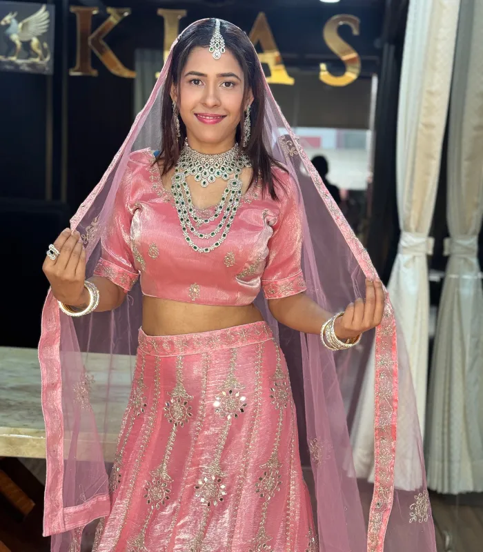 This blush pink mirror-work lehenga is a perfect blend of elegance and sparkle. Delicate embroidery shimmers beautifully with every movement, while the soft net dupatta adds a graceful finish. Ideal for festive occasions and wedding celebrations.