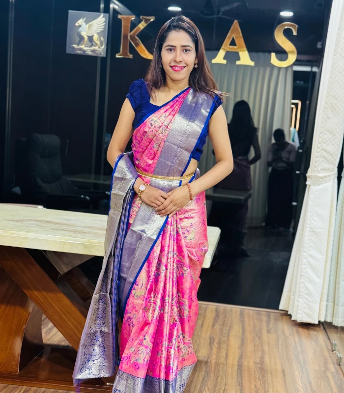 A stunning pink Kanchipuram silk saree highlighted with an elegant silver zari border and intricate woven motifs. Perfect for weddings, festive occasions, and grand celebrations.