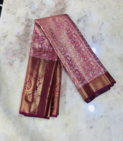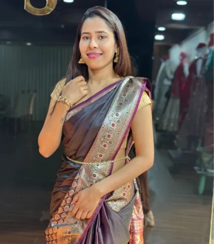 Drape yourself in timeless elegance with this exquisite Dusty Rose Copper Mysore Silk Saree. Crafted from smooth, lustrous silk, this saree showcases a soft yet radiant dusty rose shade with a warm copper undertone that enhances its royal appeal.