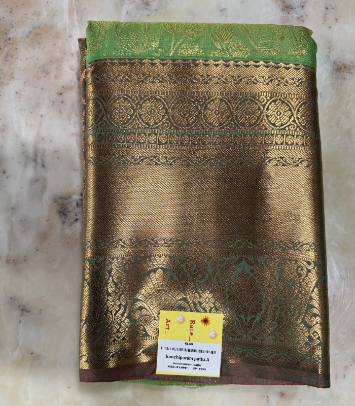 A vibrant parrot green Kanchipuram silk saree featuring elegant zari floral weaving and a broad traditional gold border — perfect for weddings and festive occasions.