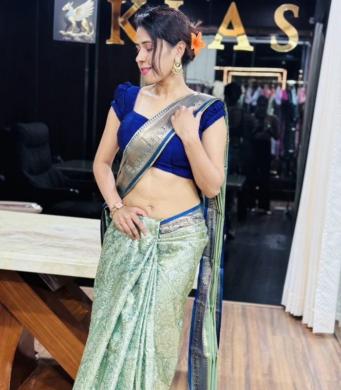 The rich royal blue zari border and pallu add depth and regal charm, enhancing the overall grandeur of the saree. The beautiful contrast of soft green and bold blue makes it a perfect choice for weddings, receptions, traditional functions, and festive occasions.