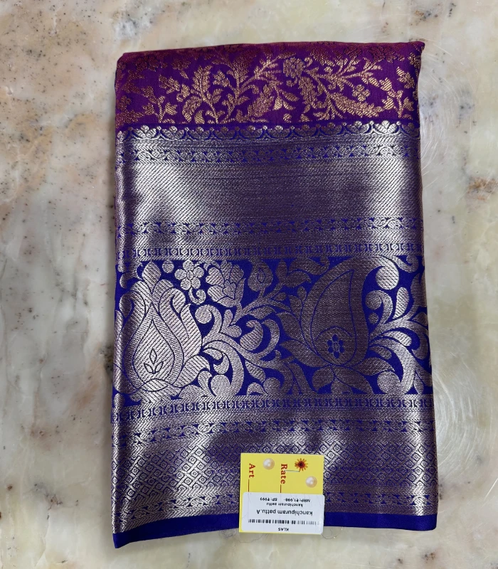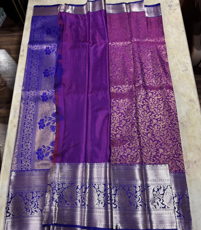 A rich purple Kanchipuram silk saree featuring intricate gold zari floral weaving and a striking royal blue-silver zari border — perfect for weddings and festive occasions.