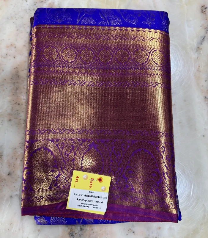 A rich royal blue Kanchipuram silk saree featuring elegant zari floral weaving and a broad traditional gold zari border — perfect for weddings and festive celebrations.