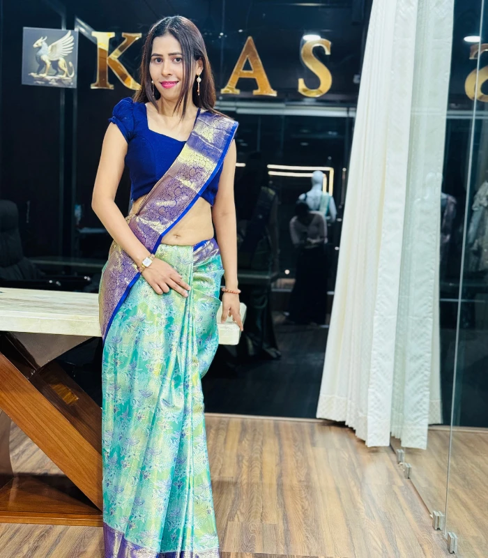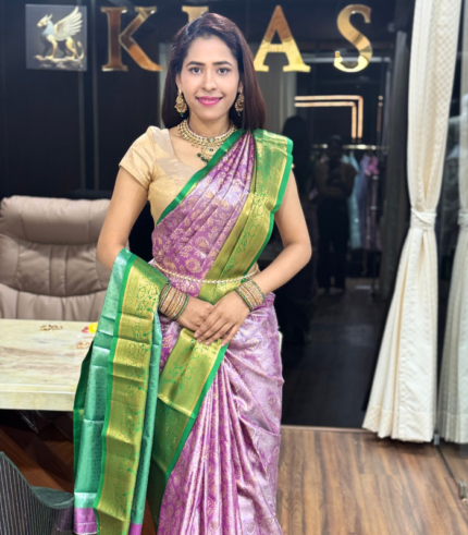 This exquisite Kanchipuram (Kanjeevaram) silk saree showcases the timeless beauty of South Indian craftsmanship. The saree features a luxurious teal-green body with subtle woven floral motifs, giving it a graceful sheen and rich texture. The highlight is its contrasting royal purple border, intricately woven with traditional gold zari patterns that add depth and grandeur to the drape.