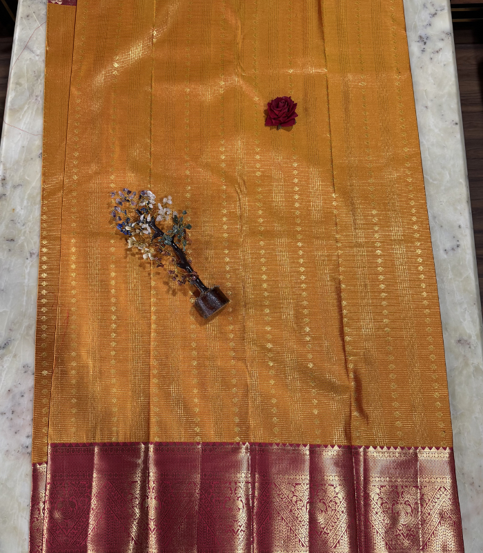 Elegant mustard yellow silk saree with delicate zari buttas and a rich maroon zari border. A perfect blend of tradition and grace, ideal for festive and special occasions.