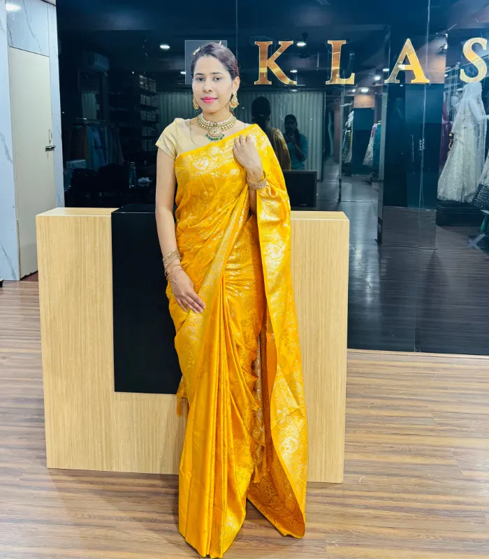 This stunning yellow saree brings together vibrant color, graceful texture, and traditional detailing.
